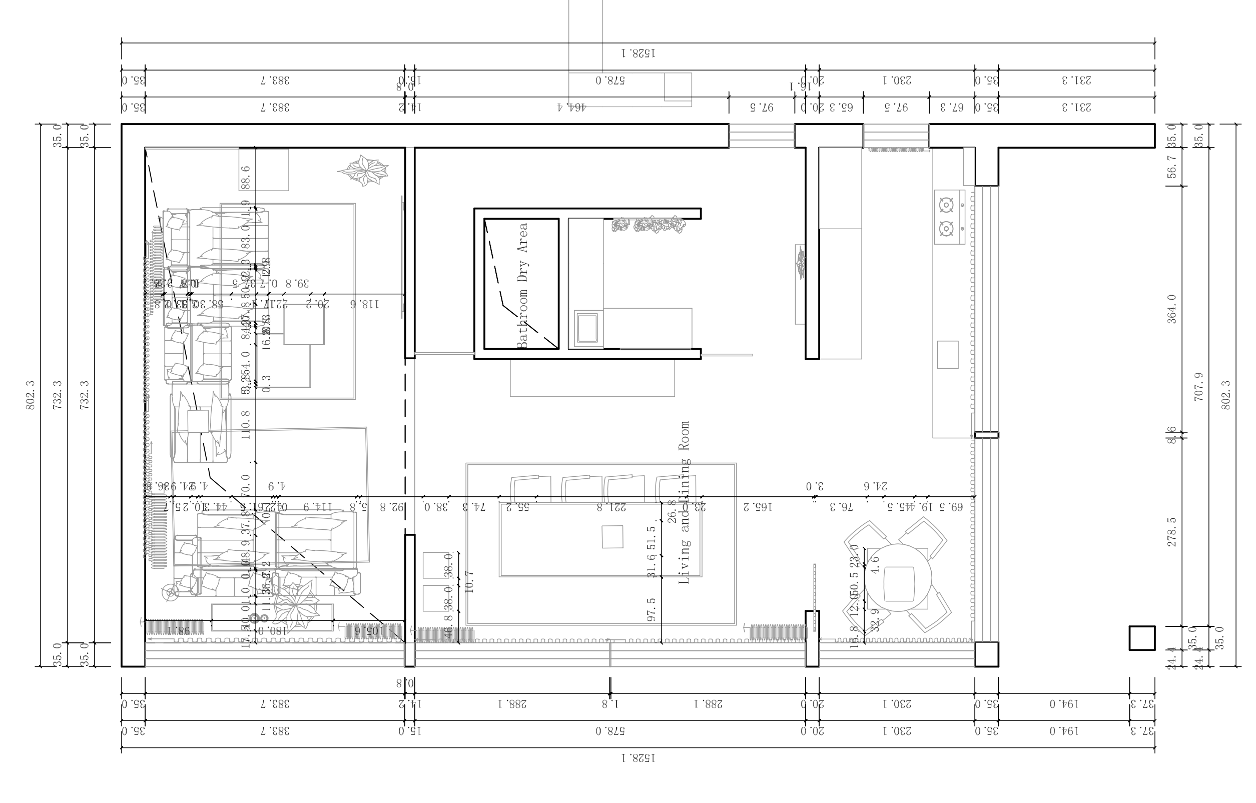 Verlaagde woonkamer, Keuken, Eetkamer, Entree